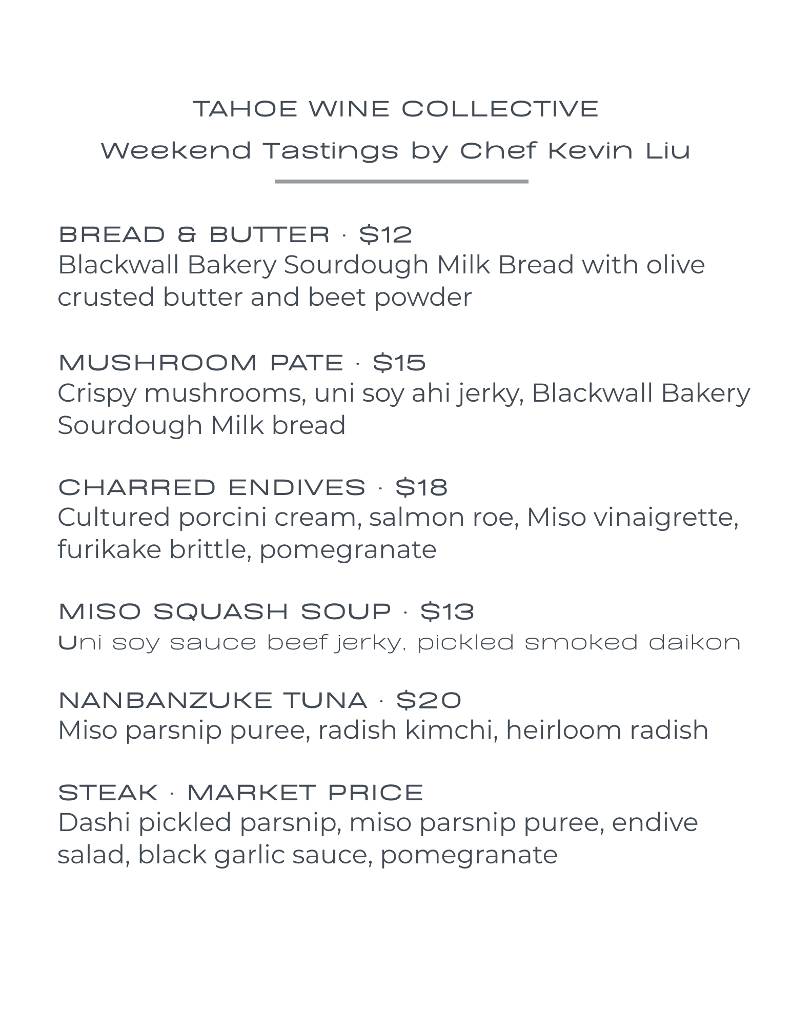 Categories: All Essentials Menu Event Sign Up To-Go, Shop, & Sign Up All | Essentials | Event Sign Up | Comedy Night in Tahoe City Saturday October 25 - Doors open at 7:00pm, laughs start at 7:30pm $25.00 Paint and Sip with Painted Vine - Sunday October 26 $50.00 Custom Wine Tasting Experiences at Tahoe Wine Collective from $45.00 Blind Wine Tasting Fridays - All day Every Friday $28.00 Hike & Sip with Tahoe Wine Collective $50.00 Curated Wine Experiences Delivered for your Tahoe stay from $149.99 Farmers Market Inspired Lunch by Chef Kevin Liu from $12.00 Gift Card from $25.00 Tote bag $28.00 Organic denim tote bag $32.00 Wine tumbler $30.00